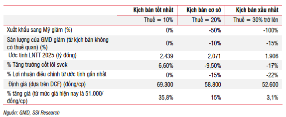 Ngay cả trong kịch bản xấu nhất với mức thuế quan lớn hơn hoặc bằng 30%, chúng tôi cho rằng cổ phiếu GMD vẫn có tiềm năng tăng giá. Giá cổ phiếu hiện chưa phản ánh giá trị của việc thoái vốn các tài sản không cốt lõi, mà chúng tôi ước tính có giá trị tài sản ròng (NAV) đạt khoảng 11.000 đồng/cp. Chúng tôi duy trì khuyến nghị