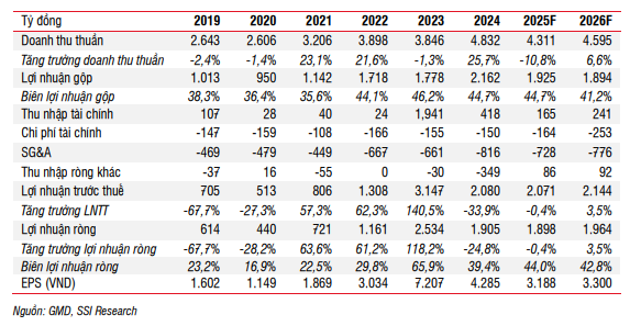 - Tác động tiềm năng của thuế quan: Sản lượng hàng hóa đến Mỹ của GMD hiện chiếm khoảng 15% tổng sản lượng. Trong ngắn hạn, công ty sẽ được hưởng lợi từ hoạt động tích trữ hàng hóa, giúp sản lượng tăng mạnh trong quý 1 và dự kiến sẽ tiếp diễn trong quý 2. Tuy nhiên, trong trường hợp thuế đối ứng không được đàm phán thành công để giảm xuống từ mức đề xuất 46%, chúng tôi kỳ vọng áp lực lên sản lượng và kết quả kinh doanh sẽ bắt đầu có tác động từ nửa cuối năm 2025.